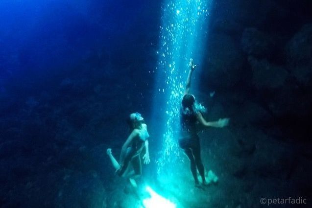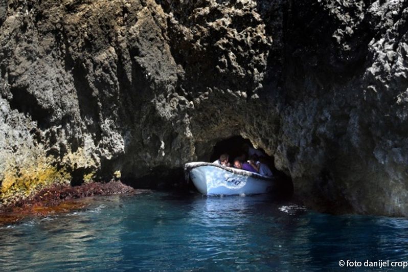 We are cruising with a new 8m speed boat. First we will visit - Green cave on the small island of Ravnik on a south side of the island of Vis. Through a crack in the ceiling of the cave the sun's rays reflecting with a greenish color and creating a captivating light effects. Swimming is allowed here and if you like snorkeling you can swim in the cave. ( entrance is 8 - 10 Euro / person ).